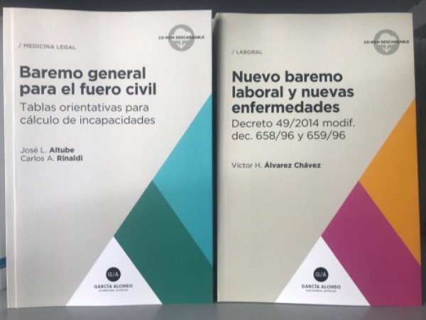 2 libros + CDROM descargables con tablas de evaluación de incapacidades para el fuero laboral (baremo laboral ART) y para el fuero civil (Baremo general para el Fuero Civil de Altube-Rinaldi).